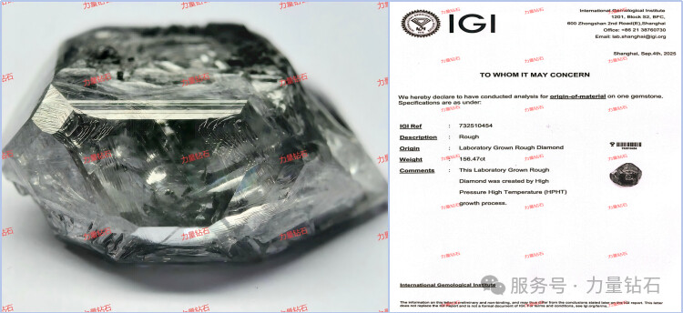 近日,在第拾伍屆中國河南國際投資貿易洽談會上,力量鑽石宣布通過高溫高壓法成功培育出壹顆重達156.47克拉的鑽石原石。並通過了國際寶石研究院(IGI)鑒定,該鑽石為目前已知全球最大的人工培育鑽石單晶,刷新了2022年由Meylor Global公司保持的150.42克拉世界紀錄,標志著鑽石功能化應用時代即將到來。