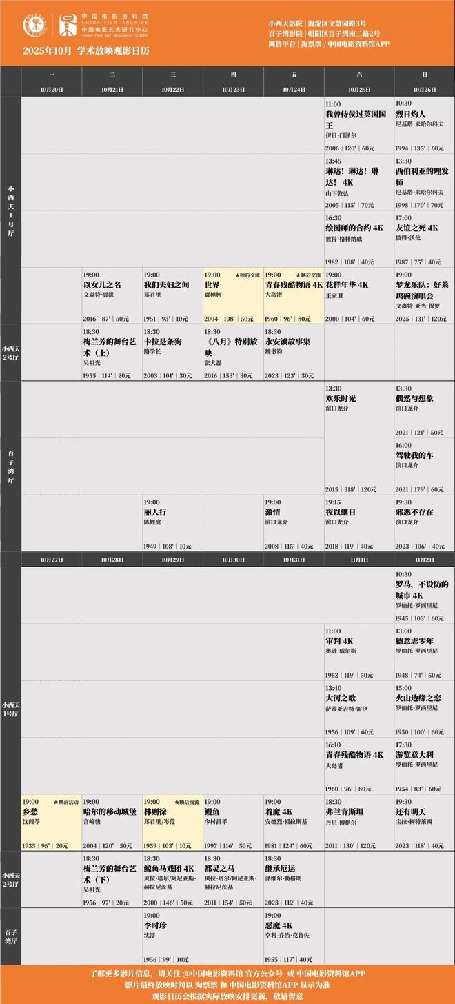所有场次均可在淘票票、中国电影资料馆APP购票,具体排片见末图,祝大家观影愉快。??