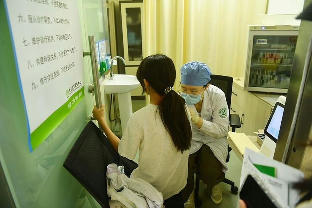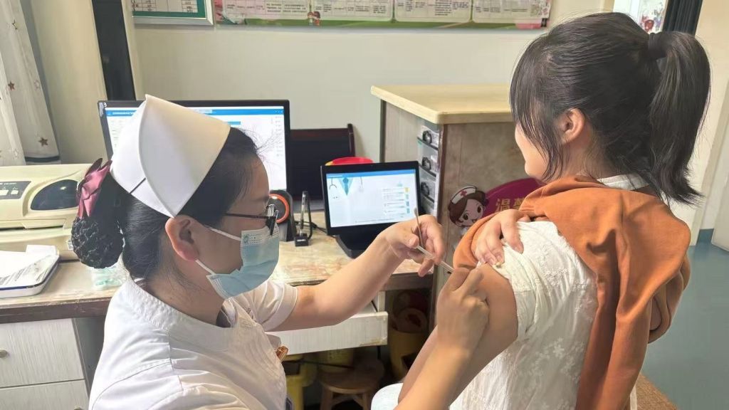 2025年9月6日9時,北京通州區潞城社區衛生服務中心預防接種門診探訪,現場3個HPV疫苗接種台口均已經有家長在陪同孩子接種疫苗。(CFP)