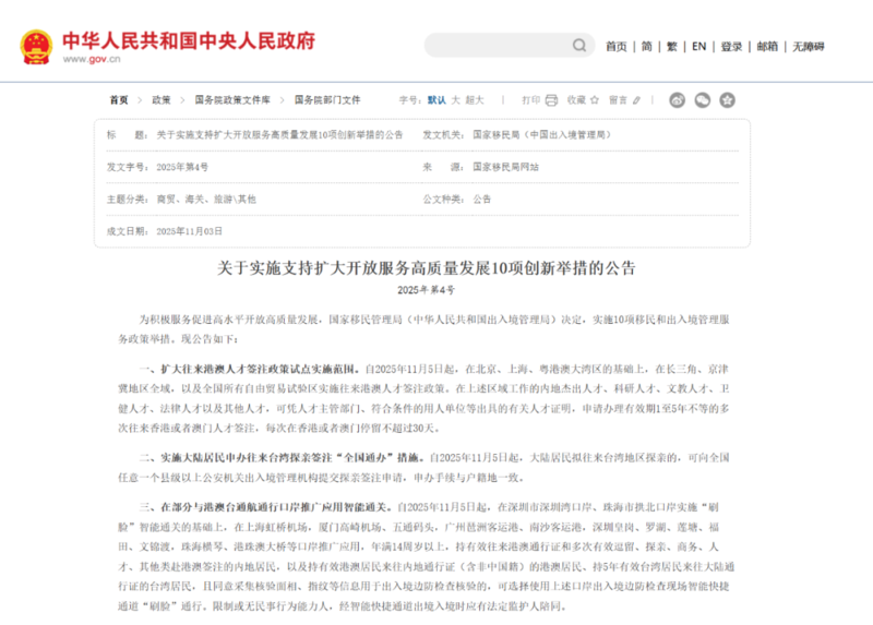 自2025年11月5日起,在河套深港科技创新合作区深圳园区实施以下便利措施。对于在合作区科研院所、科技创新企业等机构工作的内地人才,经合作区深圳园区管理部门备案后,公安机关出入境管理机构可予签发3年多次有效往来香港、澳门人才签注,申请时免予提交人才证明。允许新兴、初创企业首年度免纳税额办理往来港澳商务备案,对高新技术、高端制造等重点企业机构往来港澳备案人数名额予以倾斜。在皇岗、福田口岸设置合作区专用通道,允许深圳园区内企业机构工作人员经福田保税区一号通道入出境,为经常进出合作区的企业机构工作人员提供边检快捷通关便利,为因重大项目、重要活动等需紧急进出合作区人员提供预约通关服务。为运输科研物资进出合作区车辆开设绿色通道,优化通关查验方式,提升科研物资通关效率。
