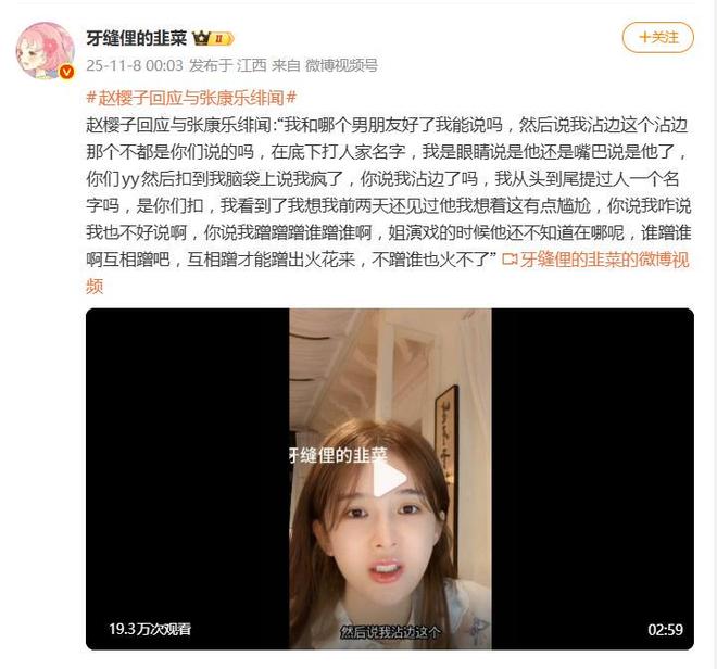 眼看輿論發酵,趙櫻子在11月4日的直播中再度回應。當被問及“張姓頂流前男友”是否就是張康樂時,她先是壹句“張康樂評論區淪陷了,你們別這樣!”成功加碼熱度,隨後才改口“說錯了”,但全程未對男方的身份予以明確否認。這壹波操作,直接導致張康樂的社交賬號評論區被網友“攻陷”。