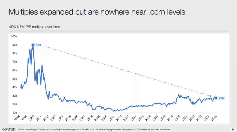 估值超过50亿或100亿美元的私营AI创企数量持续增加。但从宏观数据来看,纳斯达克100指数的未来十二个月市盈率(NTM PE)在2025年仅为28倍,而在1999年互联网泡沫时期高达89倍。