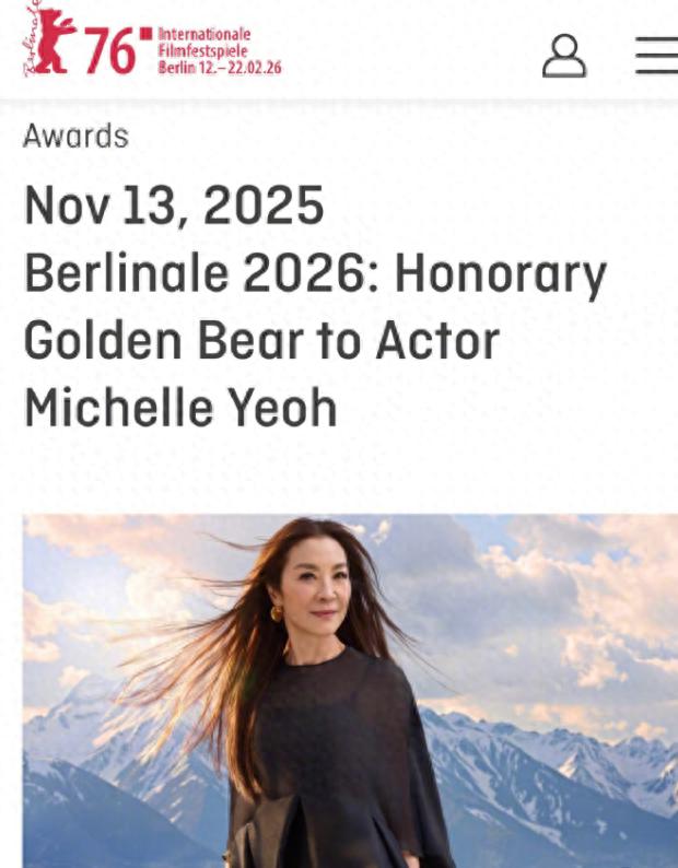 14日,柏林电影节宣布授予杨紫琼终身成就奖荣誉金熊,将于2026年2月12日在下一届柏林开幕之夜颁出。