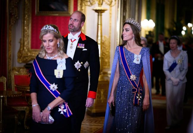到了晚上國宴,凱特頭戴維多利亞女王的“東方圓飾冠冕”(Oriental Circlet Tiara)、身穿Jenny Packham設計的亮藍色訂制披肩禮服,並穿上Gianvito Rossi Rania的銀色絲綢歐根紗高跟鞋。