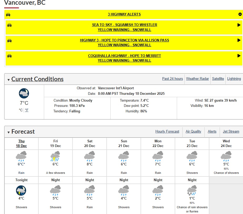 當局對海天公路 - 斯闊米什至惠斯勒、3號公路 - 霍普至普林斯頓(經艾莉森山口)以及科基哈拉公路 - 霍普至梅裡特發出了降雪警告。