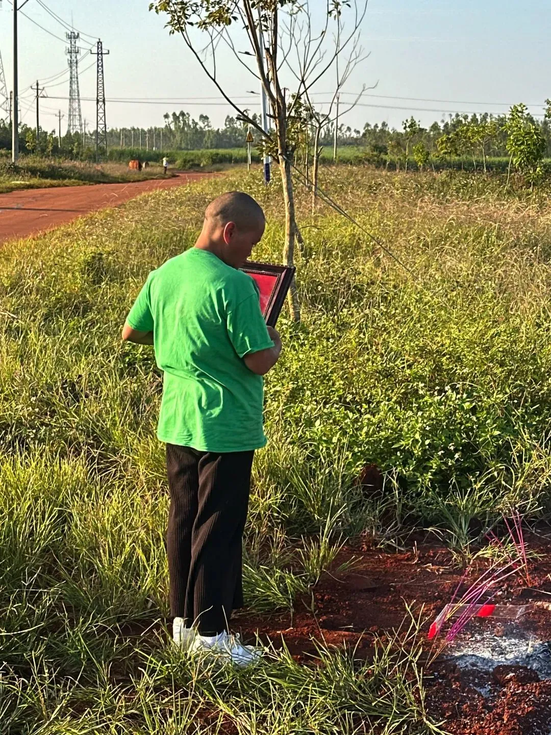 李海玉帶著父親遺像重返當年弟弟的埋屍處祭拜