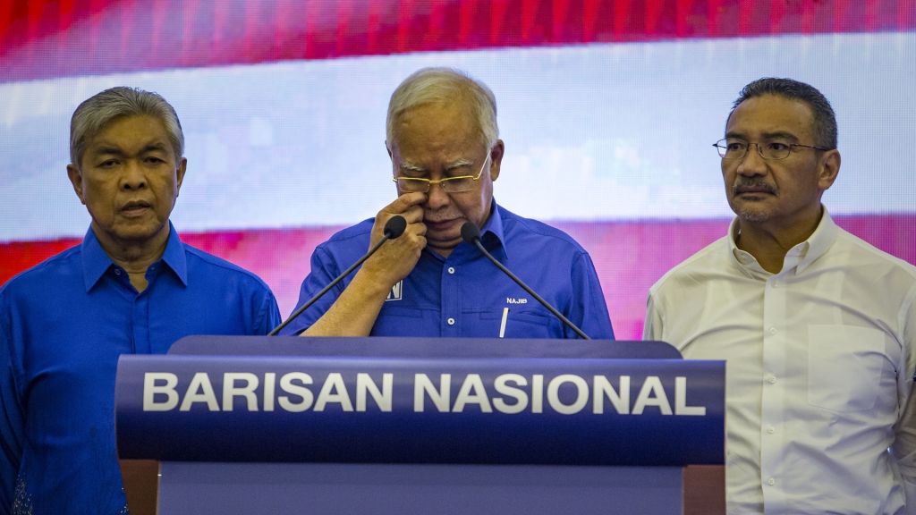 2018年5月10日至6月,馬來西亞新政府重啟對壹馬案的調查,前首相納吉布及其妻被禁止離境。警方在納吉布相關的物業搜出總值約2.59億美元的財物,當中包括大量現金、珠寶及名牌手袋。圖為2018年5月10日,納吉布就大選召開記者招待會。(Getty)