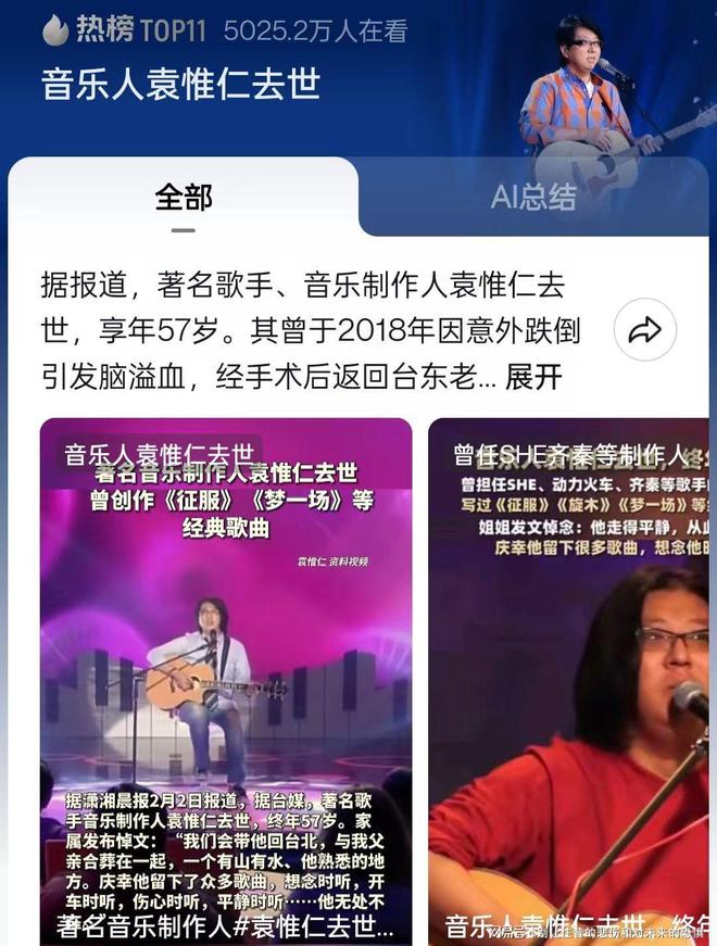 2026年2月2日,金牌制作人袁惟仁病逝,其身后不仅有《征服》《旋木》等金曲传唱,更伴随着长达14年的婚姻丑闻与巨额赌债。