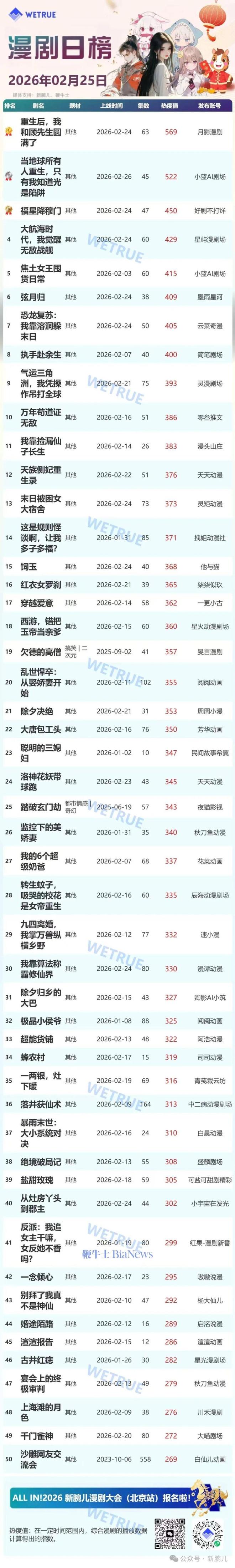 今天发布的是昨天(2月25日)漫剧及短剧付费大盘日榜。