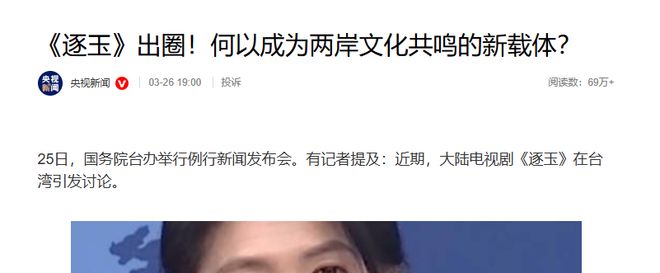 文章《《逐玉》出圈!何以成为两岸文化共鸣的新载体?》先后从“雉尾翎惊艳出圈《逐玉》再现传统戏曲之美”、“女主角樊长玉原型:女将军秦良玉”、“此前多部总台大剧风靡台湾观众被中华文化打动”3个角度进行了畅谈。