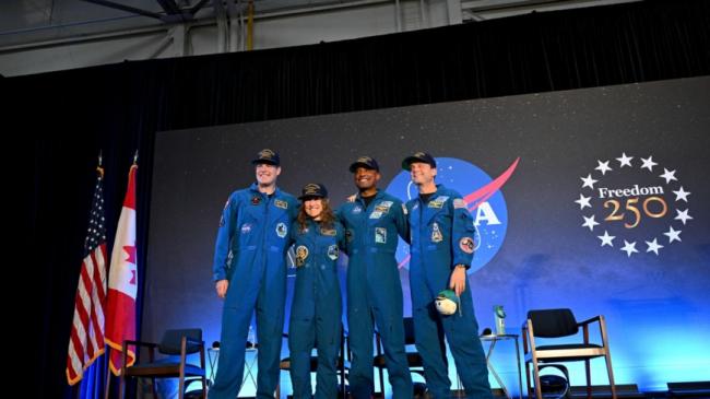 阿提米斯2號(Artemis II)的宇航員(左起):漢森(Jeremy Hansen )、科赫(Christina Koch)、格洛弗(Victor Glover)以及指揮官懷斯曼(Reid Wiseman)在返回地球後首次會見媒體。
