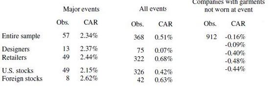下表是Event Study模型计算出来的相关公司的超额回报(CAR,*****ulative Abnormal Return,定义为实际回报率减去市场回报率,时间窗口为2天)。我们可以看到,在重大的外交或者政治仪式上,只要和蜜雪儿奥巴马沾上边,相关公司股票平均大涨2.3%,即使是一般场合,相关公司股票也会上涨0.5%。而且,那些与蜜雪儿奥巴马沾不上边的公司股票却下跌。就整个样本而言,因和蜜雪儿奥巴马沾上边,这些公司的市值总体增加26.7亿美元,平均每项活动给相关公司市值增加1400万美元。
