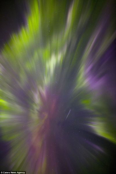 英國攝影師安東尼-斯賓塞拍攝的這張照片顯示,壹顆流星從極光中間穿過
