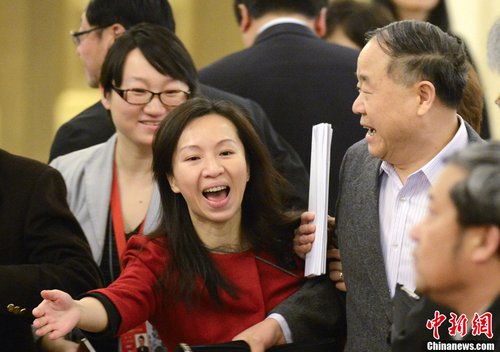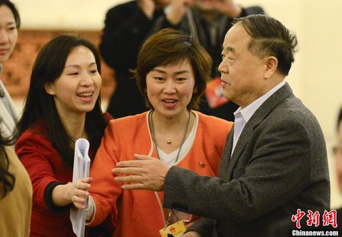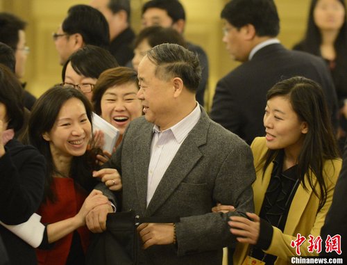 3月5日,拾贰屆全國人大壹次會議開幕在北京開幕,全國政協委員、諾貝爾文學獎得主莫言(中)前往列席旁聽,途中被美女記者“攔截”,莫言婉拒采訪。中新社發 侯宇 攝