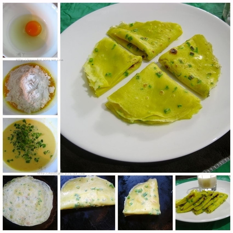 材料:雞蛋1個 面粉2勺 生粉1勺 鹽少許 蔥少許做法:雞蛋打散後放入面粉及生粉攪拌均勻,加入鹽,蔥花及少量水拌勻。 冷鍋,刷薄薄的壹層油,倒入壹湯匙的蛋液,小火,大概半分鍾蛋皮就凝固了輕輕壹掀就能翻面。關火,用鍋的余溫把另壹面 燙熟就可以了。攤第贰張餅時鍋內不用刷油了。這樣的量可以攤肆張餅。