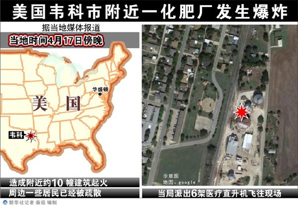 據新華網消息, 美國得州韋科市發生的化肥廠爆炸摧毀了大約叁個街區的面積,化肥廠附近壹處養老院被大火吞沒。
