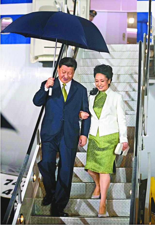 習近平的專機是當地時間31日晚7時許(香港時間6月1日凌晨),抵達該國首都西班牙港皮亞科國際機場。從中央電視台實況轉播看,當時風雨交加,專機滑行時雨勢稍緩,但鏡頭仍可見橫雨飄過。機門打開,習近平和夫人彭麗媛現身;因機場沒有遮雨舷梯,習近平惟有親自打傘,左手攜著彭麗媛,同下舷梯,大騷恩愛。