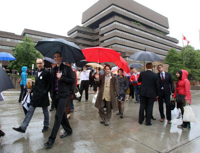 加拿大外交部雇員6日罷工,圖為大批屬於加拿大職業外交官協會的外交部雇員走出渥太華的外交部大樓。(加通社)