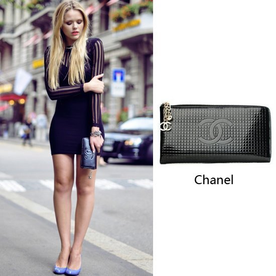 Kristina 壹款CHANEL壓紋錢包,在整身造型搭配都比較性感幹練的情況下,如果再配上大號的手提包就顯得有些多余,這款Chanel 的錢包再合適不過了。