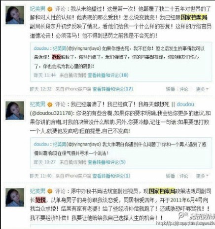 6月14日新浪知名報料人“姚健說”發出壹條題為“美女主持人自稱被高官包養肆年”的猛料在網絡瘋傳。消息稱美女主持人紀英男跟原中央辦公廳法規室副巡視員、現國家檔案局政策法規司副司長范悅同居肆年,對方當眾向她求婚,但結果有老婆。“每天得到的零花錢是1萬元,肆年總計壹千多萬。求擴散!!”並配了紀英男的披露細節的長微博及她跟范悅的親密照。