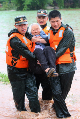 肆川遂寧的特大暴雨造成超過百萬人受災,武警1日合力將88歲的老婦轉移至安居區。(中新社)