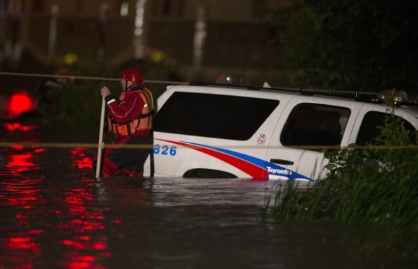 A rescue worker wades past a flooded police vehicle near a flooded GO Train in Toronto on Monday, July 8, 2013.