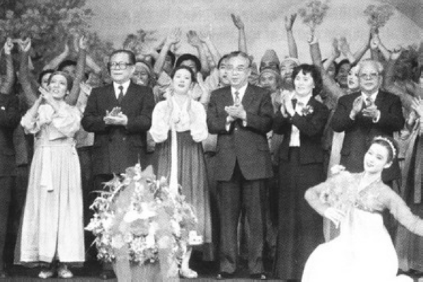 1990年3月江澤民當選中共總書記後首次外訪選擇朝鮮。這是江澤民在金日成陪同下觀看歌劇《賣花姑娘》,並在演出後與演員合影留念。