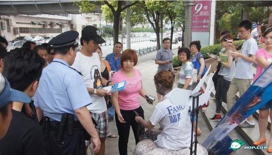 活動剛舉行了10分鍾不到就有人打110報警,兩位民警強制驅趕後。模特披上了外衣。主辦方迅速撤離現場。