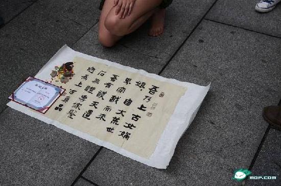 中午時分,該名身著原始的樹葉造型服飾的女子悄然出現西單大悅城門前,將壹頁印有“大字報”的宣紙鋪在前方,上面內容卻頗為怪異,字體皆為繁體手寫,內容更與現代人說話書寫習慣完全不同:“吾乃上古女媧娘娘,自大荒世界穿越而來,吾有補天遺石為證,專家鑒定為上古真品。”自稱“女媧娘娘”的女子行為怪異,穿著風騷前衛,具有范思哲的范兒,保安人員無法界定是否驅逐,只能晃來晃去,但當時是周末高峰,女媧娘娘怪異行為顯得格外引人注目,身邊不壹會時就聚集起壹大群圍觀群眾,讓保安人員也有些無奈。