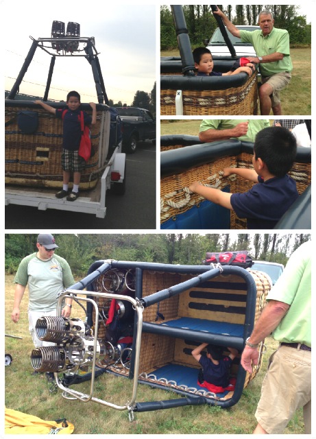 下午六點我們准時到了集合的Woodiville酒莊,每次熱氣球能載8名乘客外帶壹位Captain Bill ,等8名乘客都到齊了,他們就拉著熱氣球的大Truck和乘客到了壹片空曠遼闊的荒草地。Captain Bill讓果果爬進熱氣球下面的筐裡,給大家演示安全須知,果果有點小緊張。