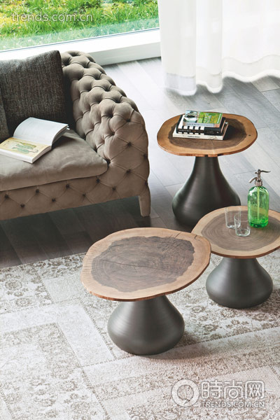 沒有足夠的空間和時間,只是壹兩件家具也能瞬時將室內演變出戶外效果。高低錯落的小茶幾,好像隱藏在森林中的野生蘑菇,讓人不禁聯想起郁郁蔥蔥的樹林和綠地。