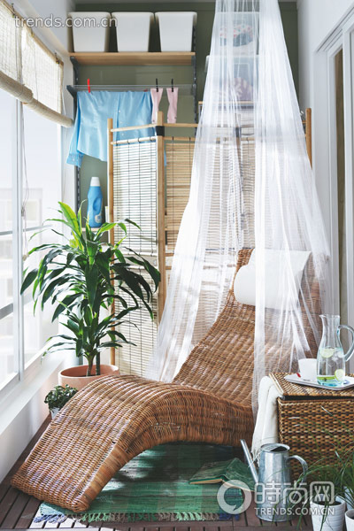 別怕麻煩,你那寬大的陽台不應只用來晾衣服和堆放雜物。把戶外家具搬到陽台,用屏風遮擋住雜亂,壹張小幾外加壹株植物,盡情享受吧。
