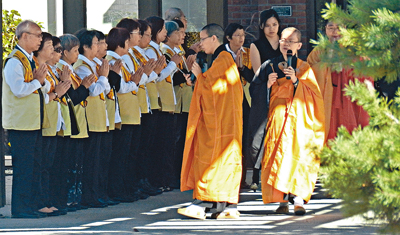■多倫多佛光山法師為張永偉誦經。本報記者攝