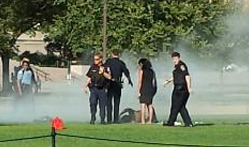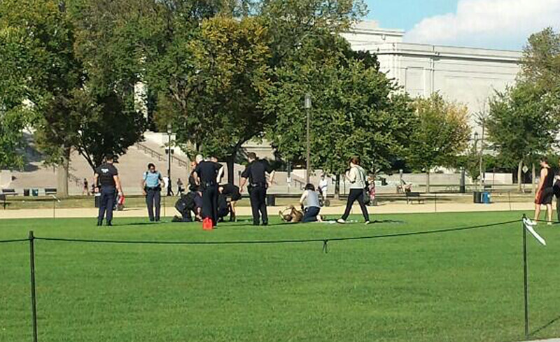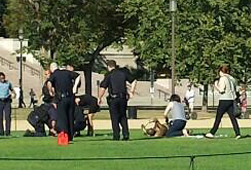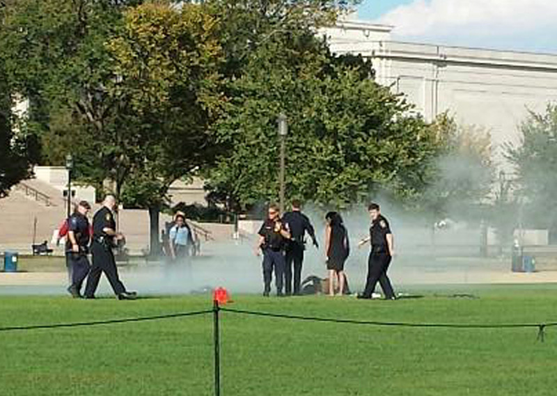 繼3日壹女子駕車沖撞國會山前路障被警方擊斃後,10月4日又有壹名男子在國會大樓前的國家廣場上自焚。目前男子動機不明,案件在進壹步調查中。下圖為男子自焚後,附近行人和游客第壹時間作出反應,上前幫忙滅火。躺在草坪上的人就是自焚的男子。從附近仍在冒煙可以想見幾分鍾之前他身上火勢之凶猛。