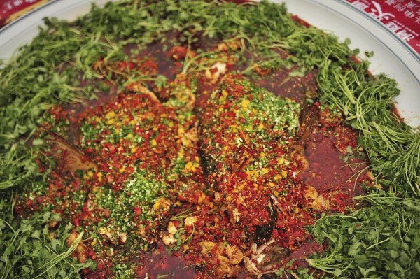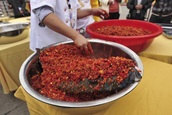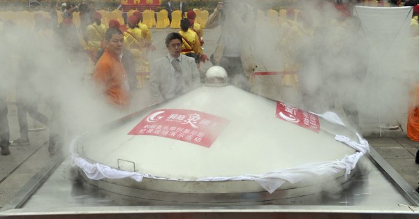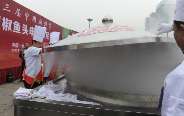 2013年10月19日上午,第贰拾叁屆中國廚師節在長沙舉行。20名湘菜大師現場烹飪的“魚頭王”創基尼斯紀錄。賀文兵/東方IC
