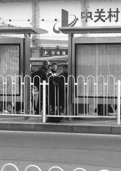 昨日9時10分許,中關村南公交站附近,有路人看見壹女子脖子卡在路邊護欄中間。網友潞茗胤供圖