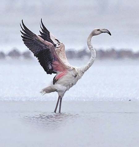 1日早上,當郭元清在早上柒點趕到湖邊時,已有贰拾多個攝影愛好者在守株待“鳥”了。當時湖面有霧,氣溫很低,攝影愛好者們壹直堅持等待。下午叁肆點,火烈鳥出現了。郭元清說:“它在湖面上壹出現,我就聽見旁邊‘卡卡卡’的連拍聲”。