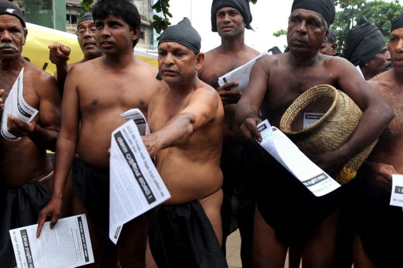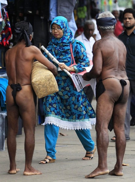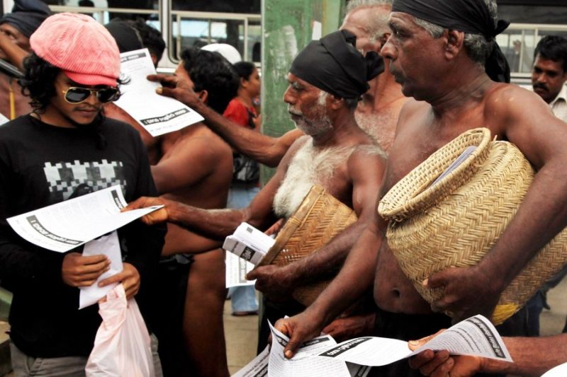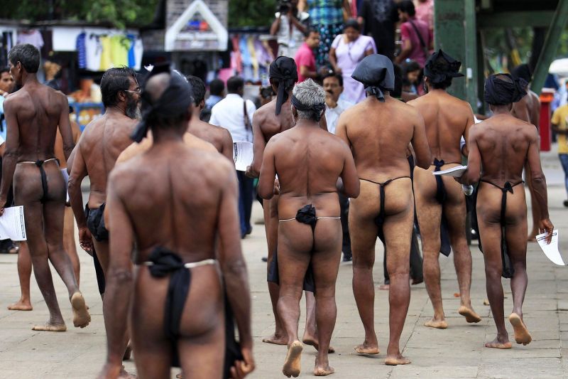 當地時間2013年12月2日,斯裡蘭卡科倫坡,斯裡蘭卡農民身著傳統纏腰布上街游行,通過分發傳單抗議政府2014年的財政計劃。示威者稱,政府在2014年預算案中將農民領取養老金的年齡提高到63歲。同時他們也希望政府馬上支付拖欠的款項。CFP供圖