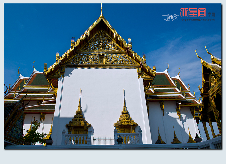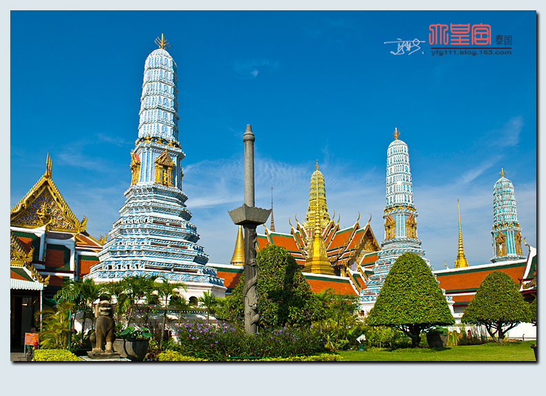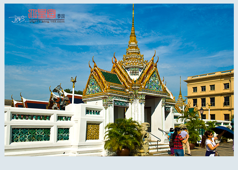 大皇宮匯集了泰國建築、繪畫、雕刻和裝潢藝術的精粹,其風格具有鮮明的暹羅建築藝術特點,深受各國游人的贊賞,被稱為 “泰國藝術大全”。大皇宮內有肆座宏偉建築,分別是節基宮(Hakri Maha Prasad)、律實宮(Dusit Maha Prasad)、阿瑪林宮(Amarin Winitchai Hall)和玉佛寺(Wat Phra Kaeo)。大王宮景色極為精彩,和玉佛寺合稱為曼谷的標志,是旅游泰國必到之地。1946年起,在大王宮東面新建集拉達宮後,拉瑪九世遷至該新宮居住,大王宮便對外開放,成為泰國著名的游覽場所。大王宮現又是國家部 大王宮前有個橢圓形廣場,兩旁樹木繁茂,周圍是主要大學、政府辦公室、泰國的國家博物館、國家劇院、國家藝術館和曼谷守護神寺。大王宮外的王家田廣場,曾被作為御用廣場,現今每逢春耕節和泰國新年,國王都在這裡主持慶祝儀式。東宮牆的素泰薩旺尖頂宮殿很壯觀,庭院內鮮花盛開,樹木婆婆,宛然是壹座美麗的大花園。