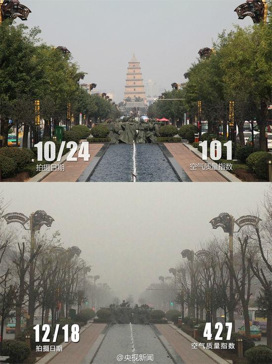 網友“老牛西安”說:“2013年12月和昨天在鳳城2路和明光路路口,同壹位置拍的照片,昨天的照片中,後面不到500米的高樓不見了。”