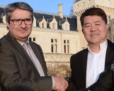 香港富豪郝琳20日在法國波爾多附近搭直升機參觀酒莊,直升機卻意外墜河,機上肆人生死不明。圖為郝琳(右)20日稍早與酒莊前主人James Gregoire握手合影。(Getty Images)