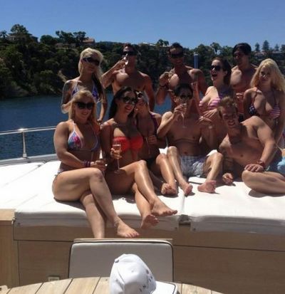 周斌與拾名澳洲男女澳洲賭城的游艇上的歡飲取樂,照片中是典型的西澳天鵝河風景,坐在照片正中的唯壹亞裔男子就是周永康的兒子周斌。