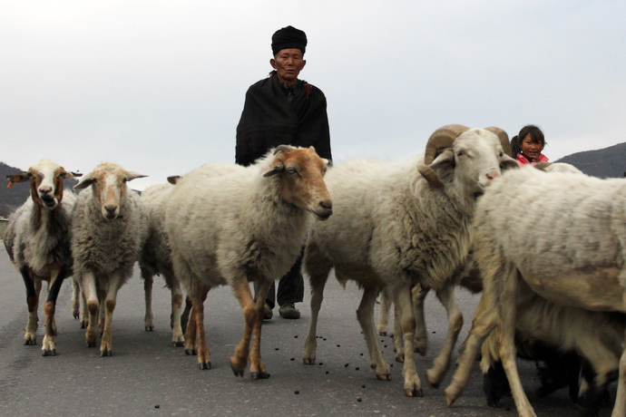 從雅安漢源縣出發往西昌方向,車行駛在G108國道上,這是壹條建造在高海拔的國道,國道上車輛稀少,路上遇見壹個小女孩陪著大人趕著壹群羊,小女孩有點怕羞,壹直故意在躲我們的鏡頭。