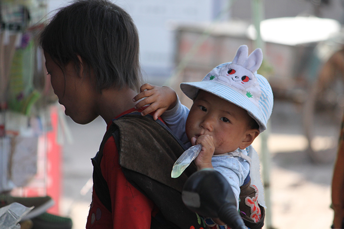 西昌集市裡,壹個小男孩背著弟弟在閒逛。