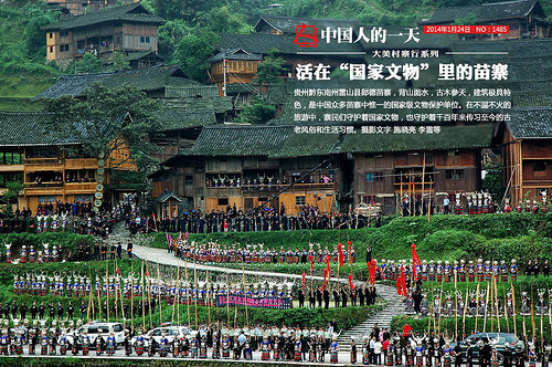 貴州黔東南州雷山縣郎德苗寨,背山面水,古木參天,建築極具特色,是中國眾多苗寨中惟壹的國家級文物保護單位。在不溫不火的旅游中,寨民們守護著國家文物,也守護著千百年來傳習至今的古老風俗和生活習慣。(圖為2008年奧運聖火傳遞經過黔東南,特地選擇繞道經過郎德,展示中國大美村寨的魄力。)攝影文字 施曉亮 李雪等