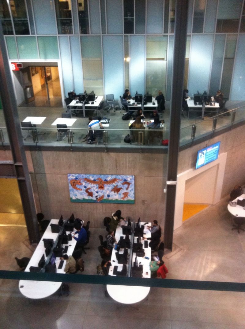 校園沒有多大般古老的歷史沉澱,輕盈透明現代化。隨處都有可休閒可討論,可讀書可插電敲筆記本,可打撲克下棋的舒適座椅,大廳的電腦中心壹天裡熱鬧非凡,上網的學習的打印的裝訂的,壹站式解決。