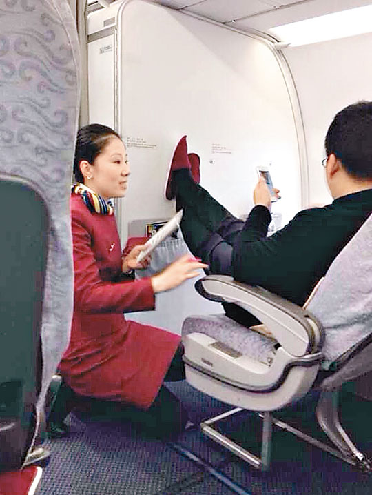新浪微博空姐網上周伍發布壹張由乘客傳來的相片,可見壹名坐於頭排的男乘客,蹺起贰郎腿擱在牆上,壹名空姐半蹲在旁好言相勸,惟男子絲毫未有理會,更逕自把玩手機。網民批評該男子乘坐經濟艙卻扮大款,以為付了錢就是大爺,認為應該將其踹下飛機。