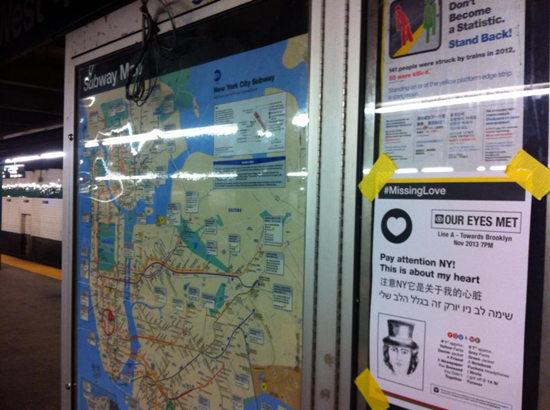 就在情人節來臨前夕,美國紐約曼哈頓壹位女藝術家在地鐵站裡貼出海報,尋找壹名在她搭乘地鐵時壹見鍾情的男子。