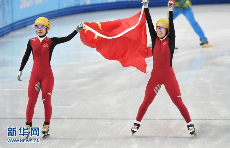 2月15日,周洋(右)奪冠後與隊友李堅柔慶祝。當日,在2014年索契冬奧會短道速滑女子1500米決賽中,中國選手周洋以2分19秒140的成績奪得冠軍。