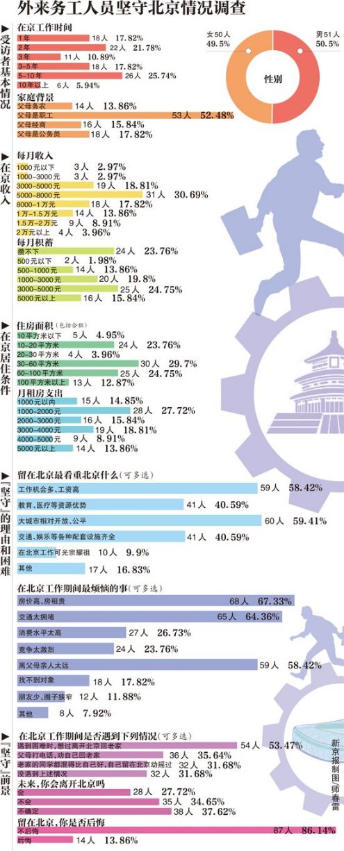 春節後,新京報對堅守在北京,以及曾在北京奮斗最終選擇離開的各個階層不同職業的人士進行問卷調查。其中在選擇留京的101位受訪人士中,雖然有6成左右的受訪者為北京“房價高”“交通擁堵”“離家遠”而煩惱,但占同樣比例的受訪者仍堅信,北京相對開放、公平,能給自己帶來更多的機會。